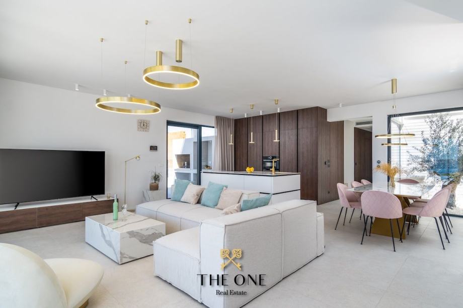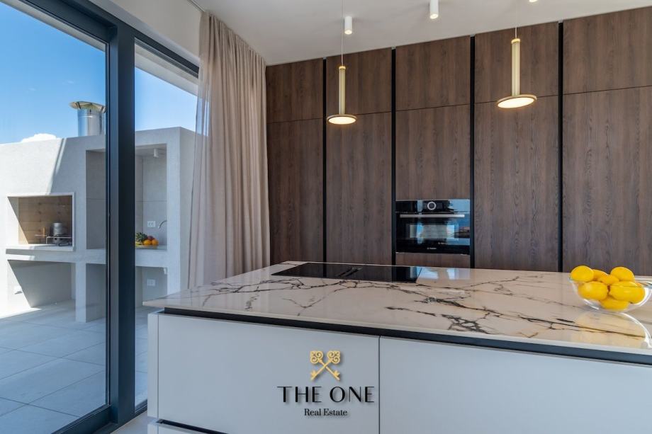 U prizemlju vile je otvoreni koncept prostora koji obuhvaća moderno opremljenu kuhinju, blagovaonicu i udobni dnevni boravak. Velike staklene stijene nesmetano spajaju unutrašnjost s vanjskom terasom, stvarajući osjećaj povezanosti. Na prostranoj terasi smješten je lounge prostor te grijani bazen od 35 m2 opremljen hidromasažnom funkcijom, kao i sunčalište. Uz to, vanjski prostor za roštilj i veliki stol za blagovanje pružaju savršeno okruženje za jela na otvorenom. Na istom katu nalazi se i wc, praonica rublja i spremište.