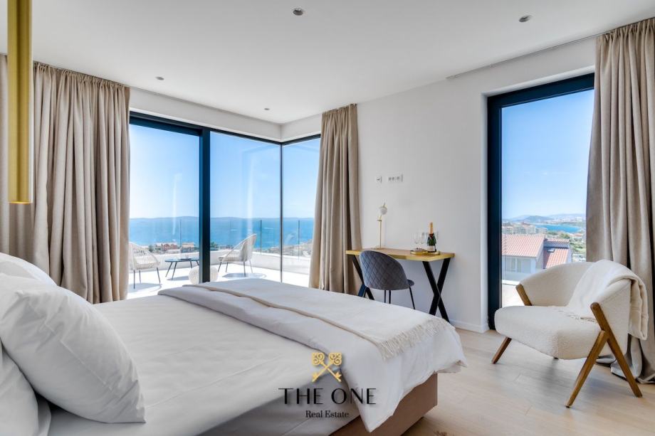 Na prvom katu predivne vile nalaze se tri prostrane spavaće sobe, svaka s vlastitom kupaonicom i balkonom s kojeg se pruža otvoreni pogled na more. Na drugom katu nalazi se glavna spavaća soba s kupaonicom i prostranom terasom s koje se pruža nevjerojatan panoramski pogled na more i okolicu. Na ovoj razini nalazi se i dodatni dnevni prostor.