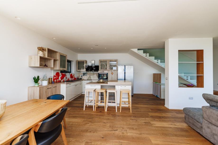 Bregi,moderna niskoenergetska kuća s bazenom i panoramskim pogledom na Kvarnerski zaljev.Ova atraktivna nekretnina nalazi se na par minuta vožnje do centra Opatije i mora.Sastoji se od prizemlja i kata.Prostrani dnevni boravak i kuhinja kao openspace prostor,kupaonica i terasa.Tri spavaće sobe,kupaonica i stubište nalaze se na katu.