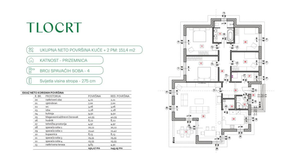 Kuće su prizemnice istog tlocrtnog rasporeda, neto korisne površine 151.4 m2 (kuća + 2 PM).