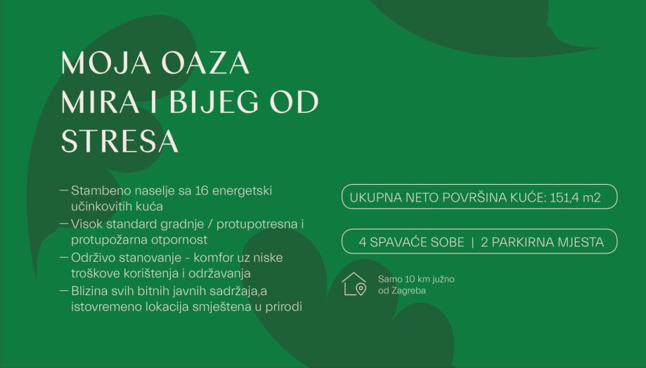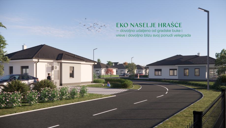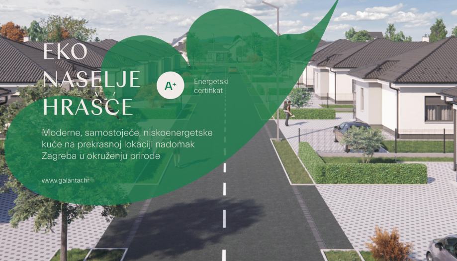 HRAŠĆE TUROPOLJSKO - prodaje se moderna, niskoenergetska montažna kuća u sklopu projekta Eko naselju Hrašće koje se sastoji se od 16 istih kuća nadomak Zagreba u okruženju prirode u mjestu Hrašće Turopoljsko (10 km južno od Zagreba u smjeru Velike Gorice).
