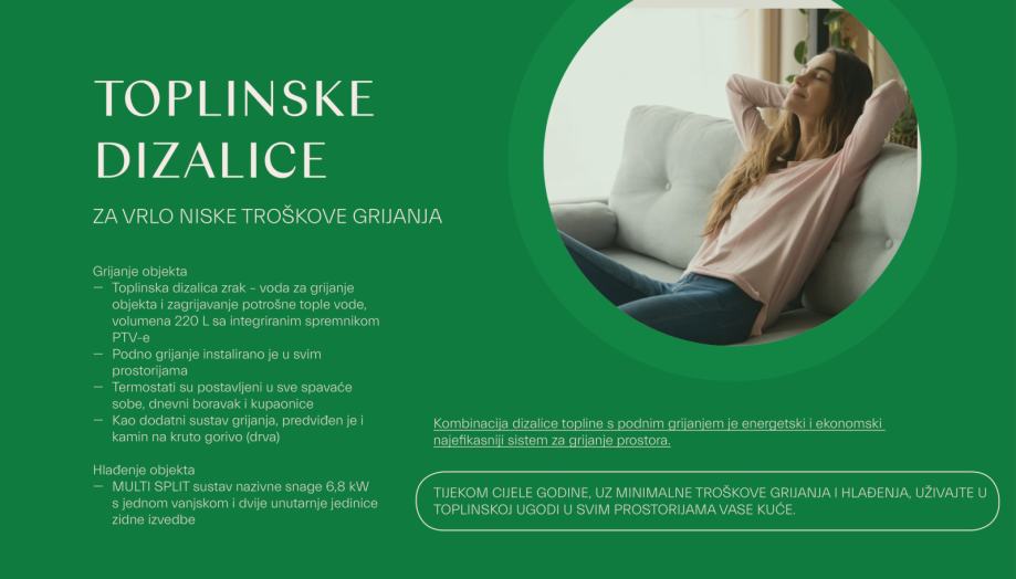 Visok i energetski učinkovit standard gradnje osigurava značajnu uštedu energije i minimalne režijske troškove. Kuća posjeduje energetski certifikat A+.