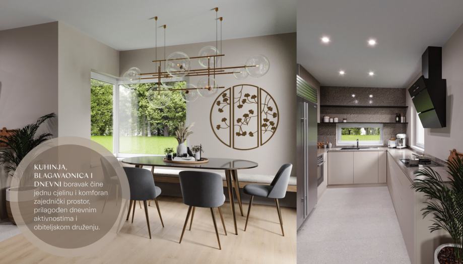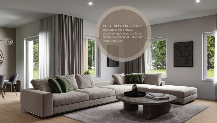 Smješten je na idealnoj poziciji, jugoistoku ili jugozapadu, te je velikom kliznom stijenom direktno povezan sa natkrivenom terasom i dvorištem. Velike površine daju dnevnom boravku poseban ugođaj, prozračnost, dobru osvijetljenost, udobnost i dobrodošlicu.