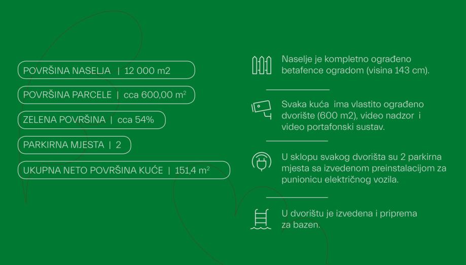 Svaka kuća ima vlastito ograđeno dvorište betafence pocinčanom i plastificiranom ogradom u antracit boji (cca 630 m2) u sklopu kojeg su 2 parkirna mjesta sa izvedenom preinstalacijom za punionicu električnog vozila.