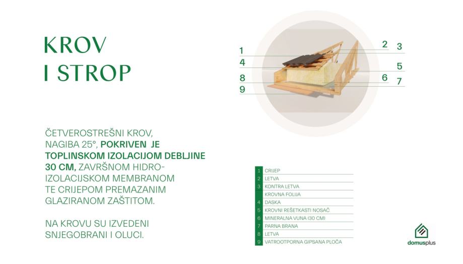 • Krovište: Četverostrešni, nagiba 25°, toplinska izolacija od mineralne vune debljine 30 cm (prirodni je crijep premazan glaziranom zaštitom sa izvedenim snjegobranima i olucima)