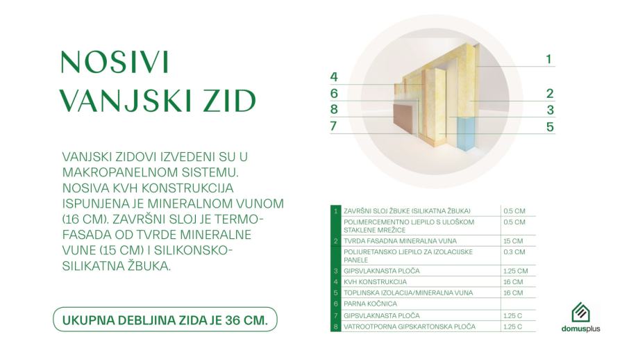 Vanjska ovojnica kuće je kompletno izolirana: 30 cm mineralne vune u stropu, 16 cm XPS-a ispod temeljne ploče te fasada u sustavu ETICS koju čini kombinacija kamene vune debljine 15 cm i mineralne vune debljine 16 cm. Ukupna debljina vanjskog zida je čak 36 cm.