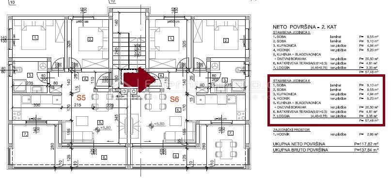 ** prodajna kvadratura stana (bez okućnice) sa uračunatim koeficijentima iznosi 57,50m2 **