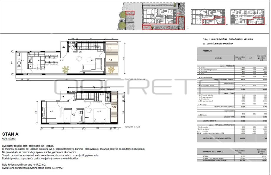 Dvoetažni trosobni stan, orijentacije jug - zapad.