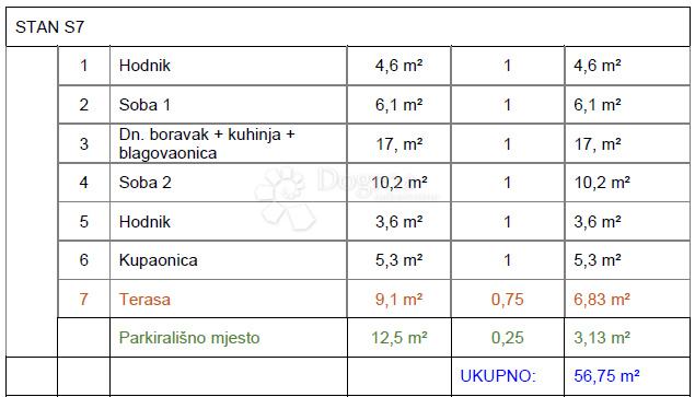 Stan ima površinu od 56,75 m² i sastoji se od:
