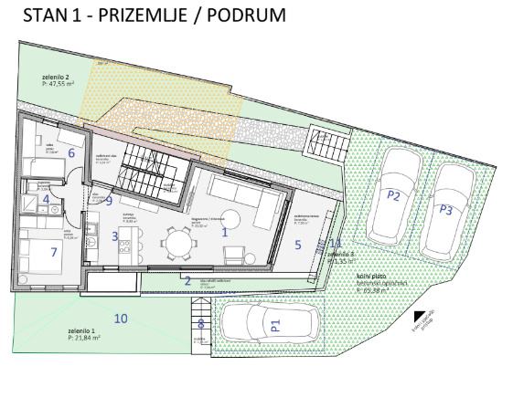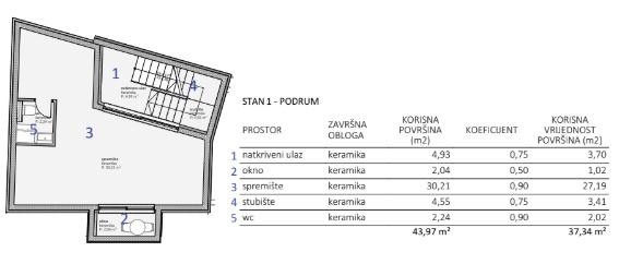 Stan, veličine 97,10 m2, smješten je u prizemlju zgrade. Sastoji se od dvije spavaće sobe, kupaonice i predivnog open space koncepta kuhinje sa blagovaonicom i dnevnim boravkom. Iz kuhinje se pristupa vanjskoj natkrivenoj terasi, vrtom, orijentirano na jugoistok, a stanu pripada i vanjsko parkirno mjesto. Također, stanu pripada i podrum površine 44 m2. Ugodan i prozračan stan, sa mnogo prirodnog svijetla, modernog dizajna i suvremene estetike, jedinstvena je prilika za kupnju.