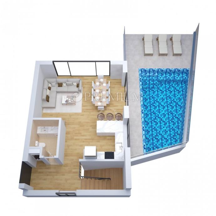 Unutarnje stepenice vode na krovnu terasu s koje se pruža panoramski pogled na more, te na kojoj se nalazi jacuzzi.