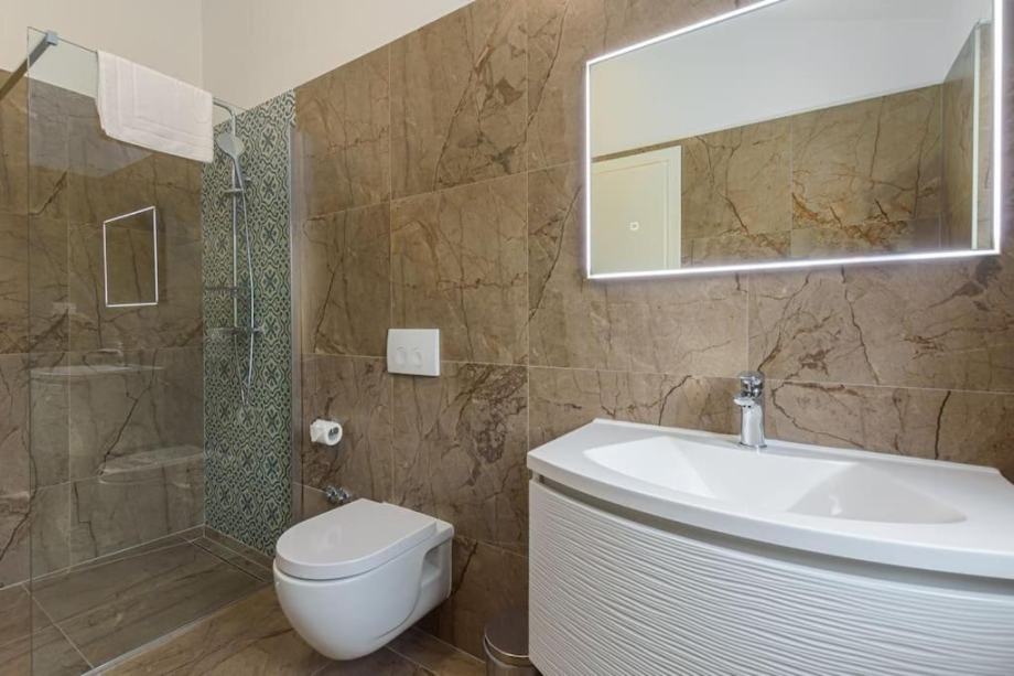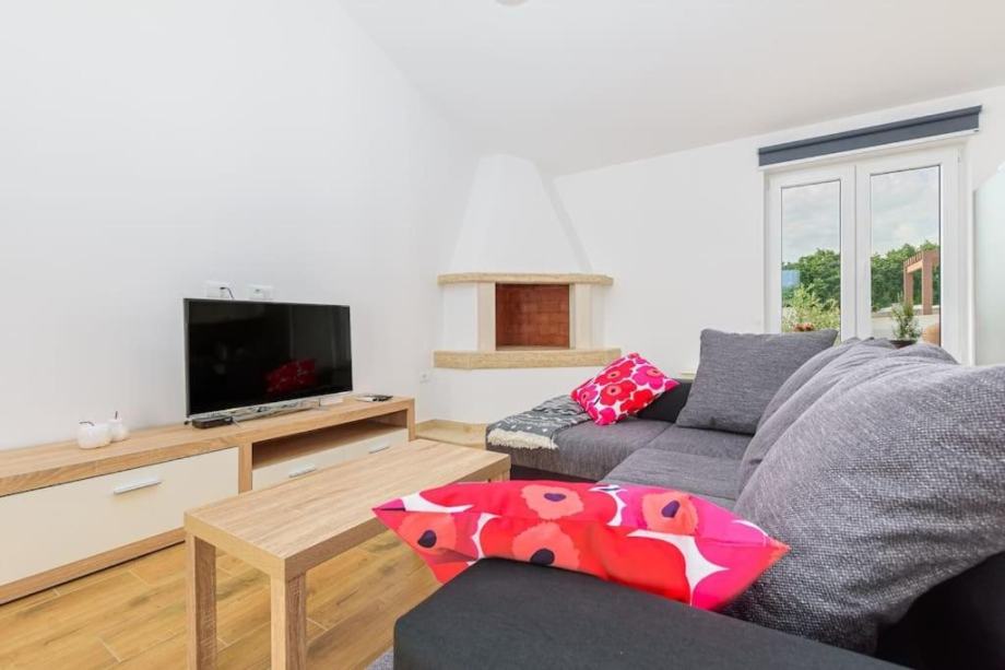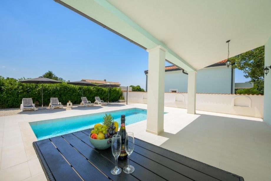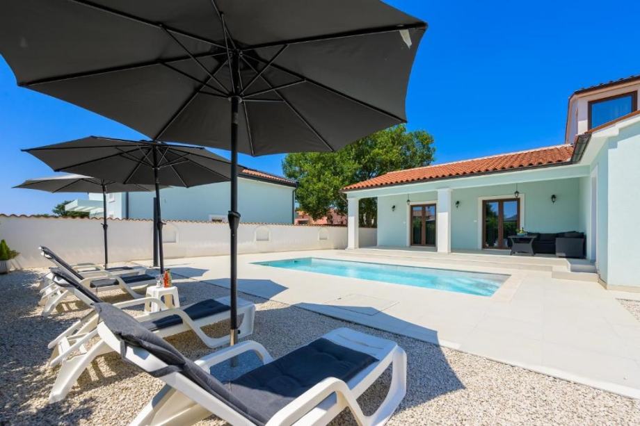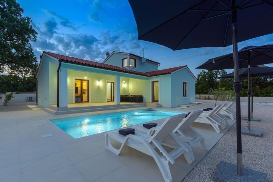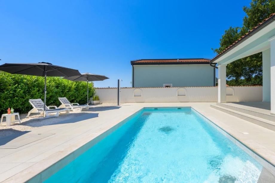 Okućnica površine od 800 m2 sadrži odličan bazen od 24 m2 , za uživanje u toplim ljetnim danima. Dostupna je i natkrivena terasa s vanjskim prostorom za druženje te vanjski kamin.