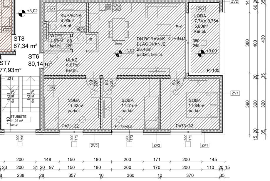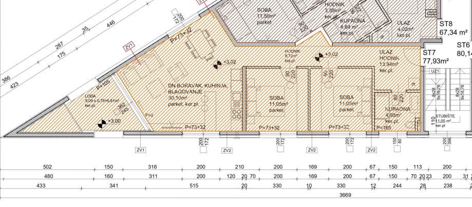 3. Trosobni stan u prizemlju oznake ST3, podne površine 71,12 m², koji se sastoji od ulaza, hodnika, kupaone, dnevnog boravka, blagovaonice i kuhinje i dvije sobe s lođom u prizemlju podne površine 6,54 m², kojem pripada parkirno mjesto oznake PM7 u prizemlju podne površine 12,50 m² i parkirno mjesto oznake PM8 u prizemlju podne površine 12,50 m²