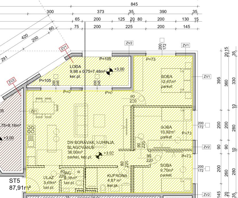 5. Četverosobi stan na katu oznake ST5, podne površine 80,43 m², koji se sastoji od ulaza, kupaone, wc-a, dnevnog boravka, blagovaonice i kuhinje i tri sobe s lođom na katu podne površine 9,98 m², kojem pripada parkirno mjesto oznake PM12 u prizemlju podne površine 12,50 m² i parkirno mjesto oznake PM13 u prizemlju podne površine 12,50 m² ukupna površina sa koeficijentom = 94,17 m2