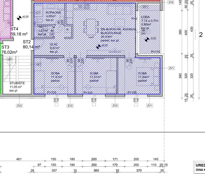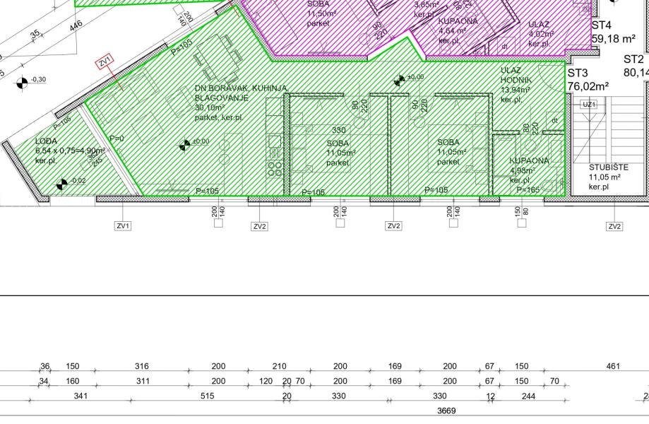 2. Četverosobi stan u prizemlju oznake ST2, podne površine 74,34 m², koji se sastoji od ulaza, kupaone, wc-a, dnevnog boravka, blagovaonice i kuhinje i tri sobe s lođom u prizemlju podne površine 7,74 m², kojem pripada parkirno mjesto oznake PM10 u prizemlju podne površine 12,50 m²