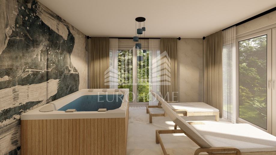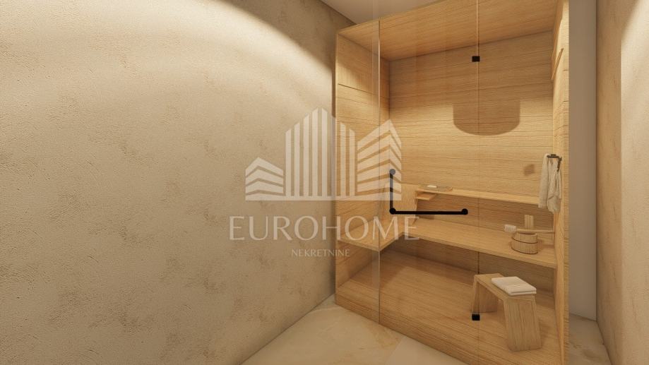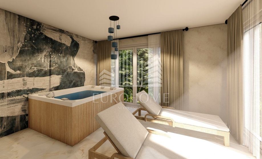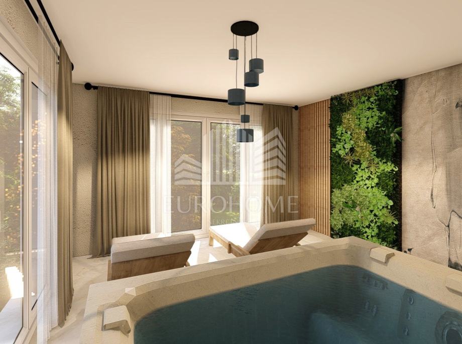 Na prvom katu se nalazi spa zona koja uključuje saunu, jacuzzi, kupaonicu s tušem i dvije terase. Krovna terasa može se pohvaliti sunčalištem i prekrasnim panoramskim pogledom na Velebit u kojem će se moći uživati iz jacuzzija.