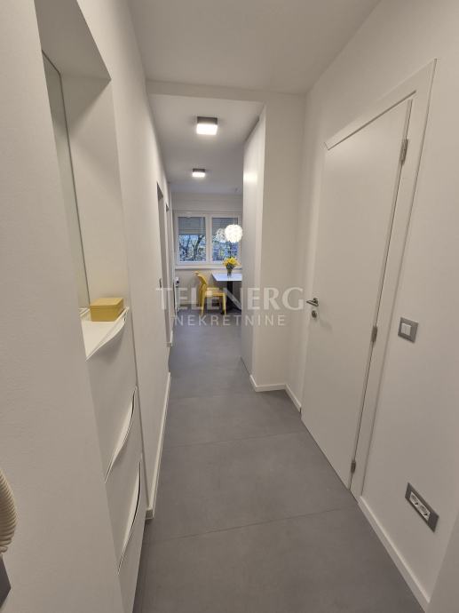 Sastoji se od dnevnog boravka s blagovaonicom i potpuno opremljenom kuhinjom (kuhinja po mjeri s kvalitetnim kućanskim aparatima: Bosch indukcijska ploča, Electrolux perilica za suđe, Bosch ugradbena pećnica, AEG frižider/zamrzivač), spavaće sobe s ugradbenim ormarima i kupaonice s tušem (perilica za rublje marke Whirlpool). Klimatizirano, grijanje na gradsku toplanu.