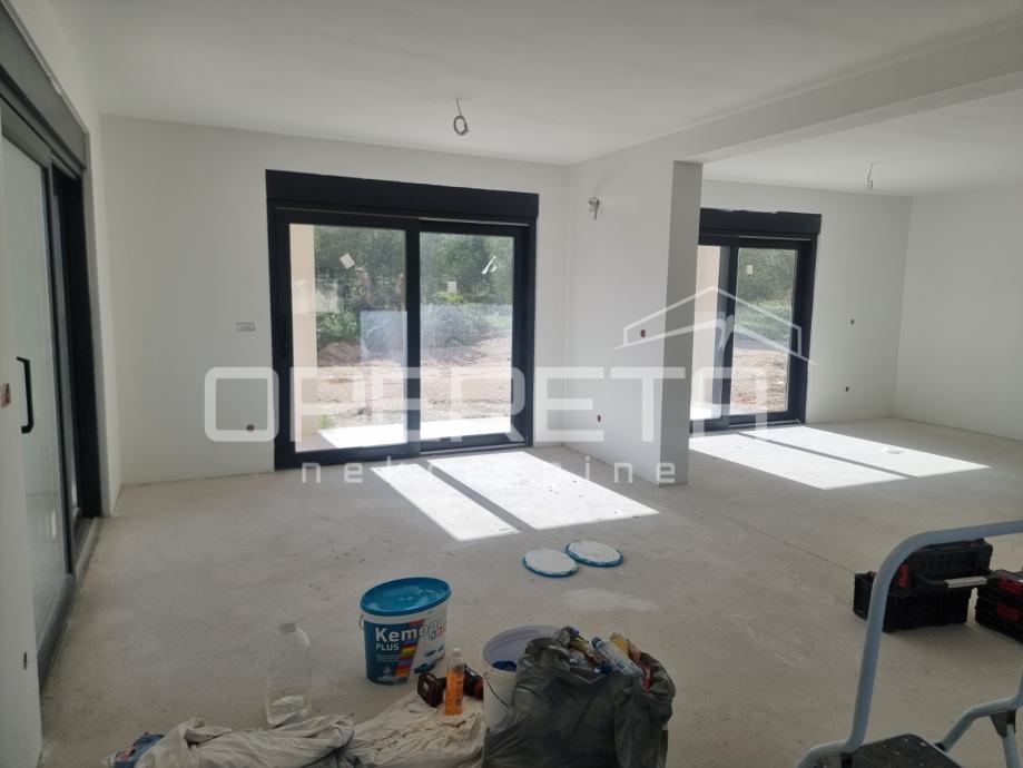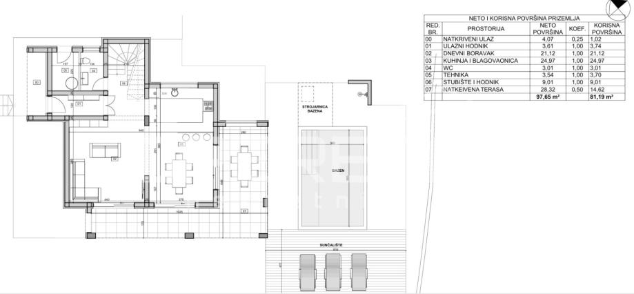 U prizemlju se nalazi prostrani open space dnevni boravak s blagovaonicom i kuhinjom, s izlazom na natkrivenu i nenatkrivenu terasu te dvorište. Na istoj etaži smješteni su još: