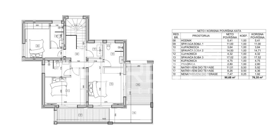 Ukupna neto površina kata iznosi 90,68 m², a terase dodatno povećavaju kvalitetu boravka.