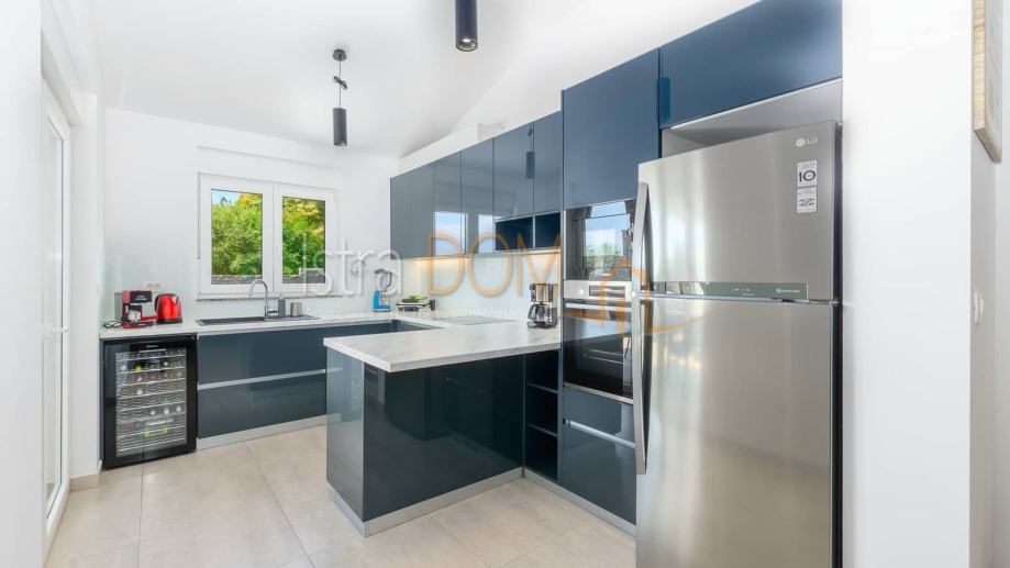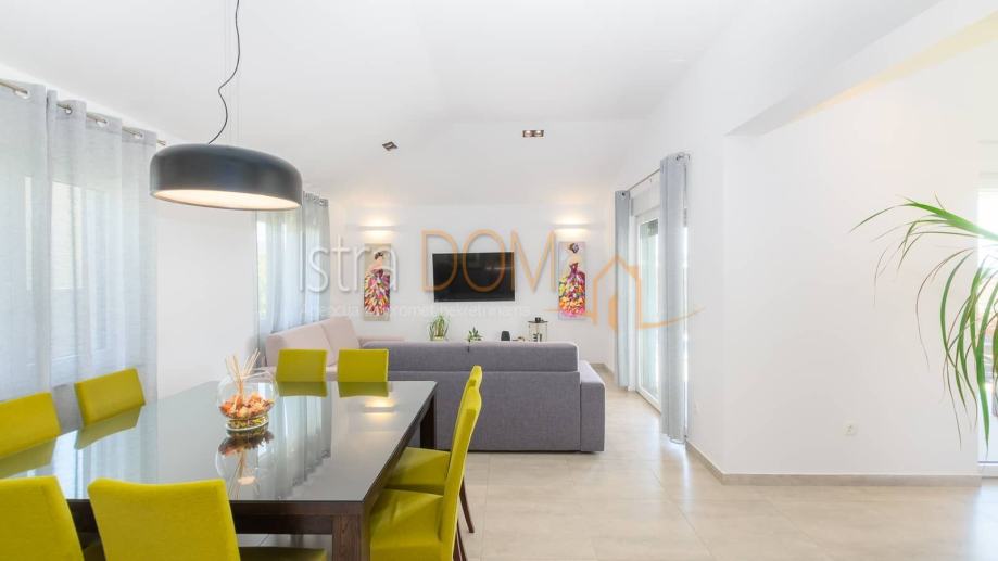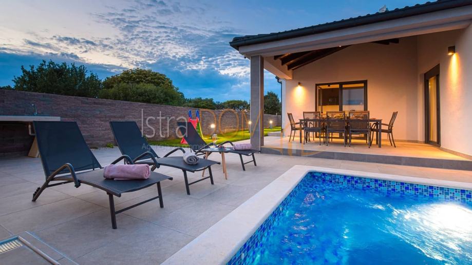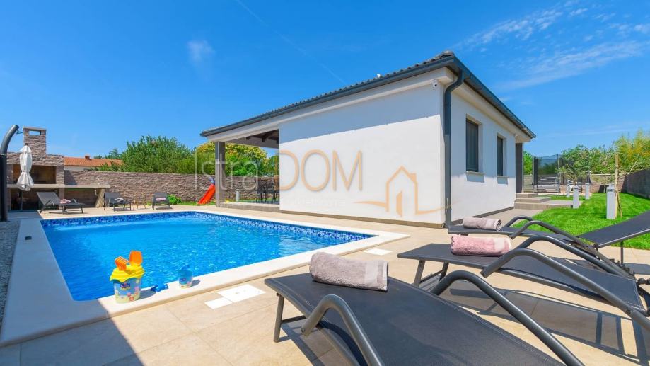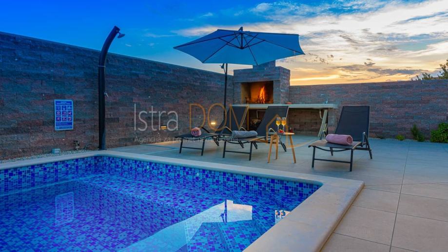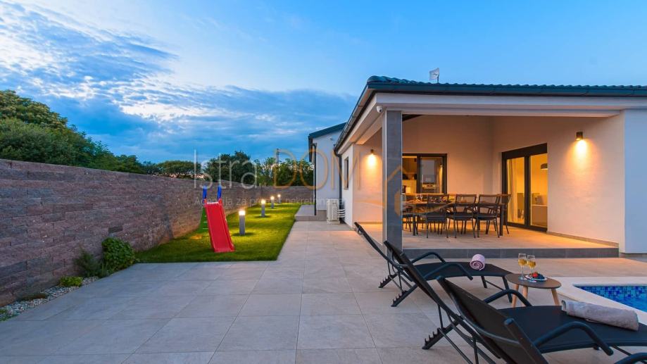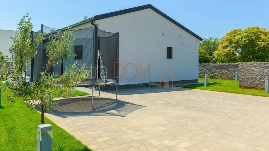 Prekrasna moderna prizemnica nalazi se na parceli veličine 559m2 sa potpuno ograđenim dvorištem. U prekrasnom dvorištu nalazi se hidromasažni bazen od 24 m2, vanjski tuš, ljetna kuhinja , roštilj, kao i natkrivena terasa, veliko privatno parkirno mjesto za šest vozila.