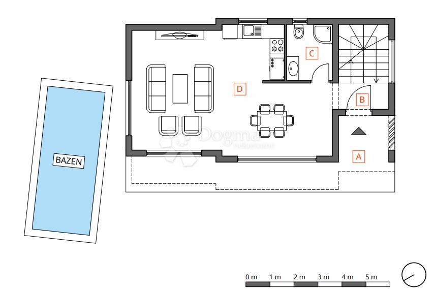 Prizemlje kuće obuhvaća ulazni hodnik, kupaonicu, open space koncept kuhinje s blagovaonicom i dnevnim boravkom, koji imaju izlaz na natkrivenu terasu i dvorište površine 255,42 m². U dvorištu se također nalazi bazen.