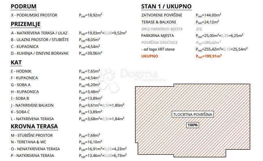 Unutarnji zatvoreni prostor iznosi 144 m², dok preostalu površinu čine terase, parkirna mjesta i dvorište.
