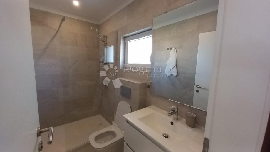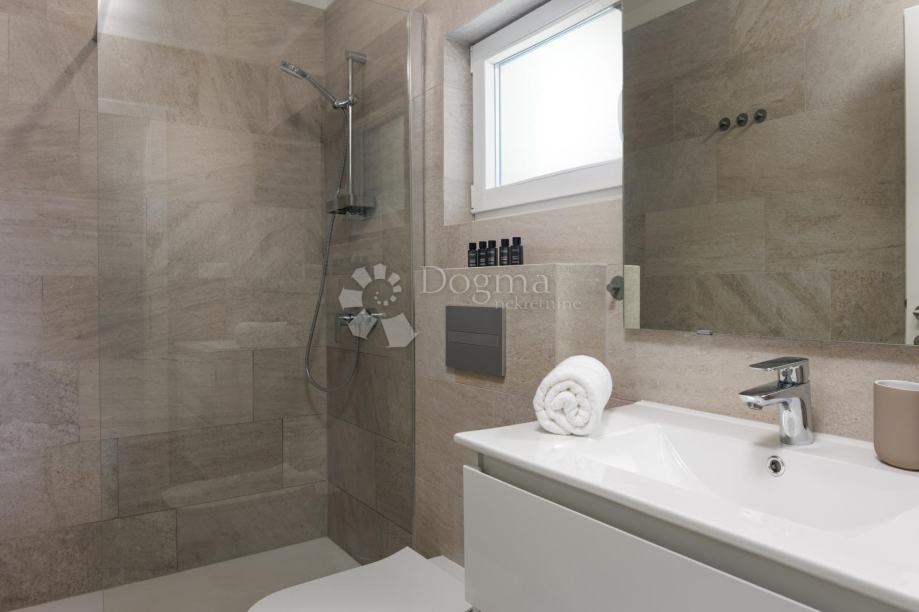 U prizemlju se nalazi potpuno opremljena kupaonica ispred ulaza i hodnik s velikim skladišnim prostorom, uključujući perilicu i sušilicu. Iz hodnika se ulazi u prostrani dnevni boravak i odvojenu kuhinju, iz kojih se izlazi na veliku vanjsku terasu uz bazen. Uz dnevni boravak, u prizemlju se nalazi zgodna spavaća soba.
