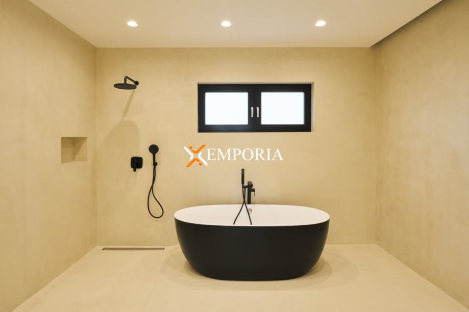 Im Außenbereich befindet sich ein 40 m2 großer Pool mit Keramikverkleidung und Vorbereitung für eine Heizung, drei Parkplätze (einer in der Garage und zwei im Freien) sowie ein angelegter Garten. Ein gemauerter Außengrill rundet den Außenbereich ab.AusstattungDie Villa ist aus Betonwänden gebaut, hat eine 10 cm dicke Styroporfassade, dreifach verglaste Aluminiumfenster mit elektrischen Rollläden und eine einbruchssichere Eingangstür. Ein Kamin mit Schornstein ist vorhanden. Die Böden sind mit Parkett und Mikrozement versehen. Die Beheizung erfolgt über elektrische Fußbodenheizung im gesamten Haus. Zudem sind fünf Klimaanlagen installiert – eine im Wohnzimmer und je eine in jedem Schlafzimmer. Die Immobilie verfügt über einen Energieausweis der Klasse A.