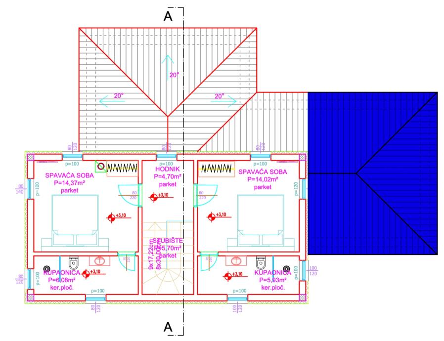 Na katu se nalaze dvije dodatne spavaće sobe (14,02 m² i 14,37 m²), svaka s vlastitom kupaonicom (5,93 m² i 6,08 m²) koje omogućuju potpunu privatnost i komfor. Dodatni hodnik i stubište povezuju dvije etaže u funkcionalnu cjelinu.