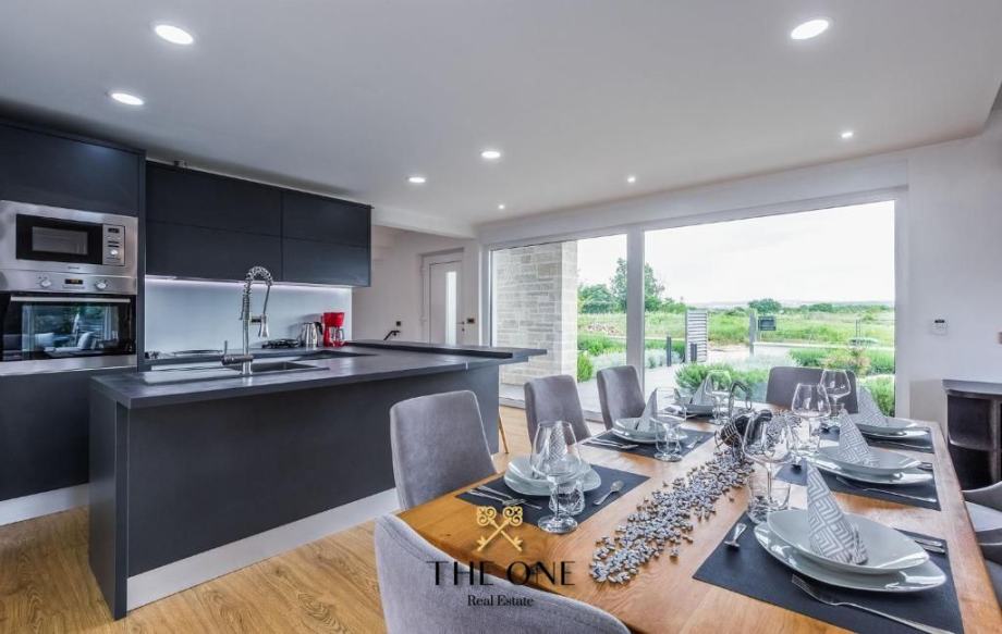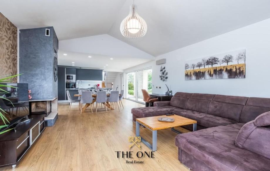 U prizemlju vile nalazi se veliki stambeni prostor otvorenog koncepta koji se sastoji od moderne kuhinje s blagovaonicom i dnevnog boravka s kaminom.