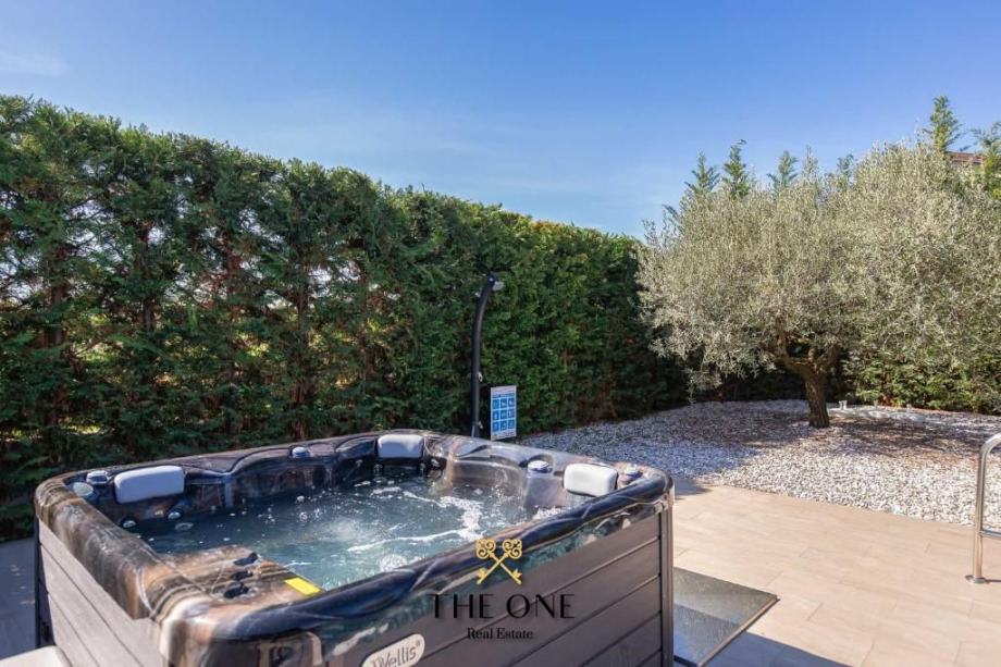 Na terasi se osim bazena sa sunčalištem nalazi i natkrivena vanjska kuhinja s roštiljem i velikim stolom za blagovanje.