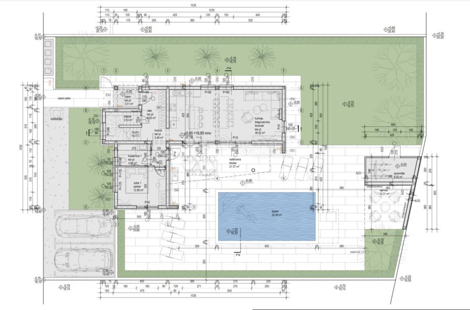 U prizemlju će se nalaziti kuhinja sa blagovaonom, dnevni boravak sa izlazom na natkrivenu terasu i plažu bazena, jedna spavaća soba, kupaona, vešeraj i ostava.