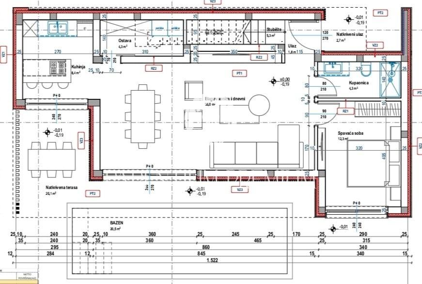 U prizemlju se nalazi osvijetljeni dnevni boravak sa kuhinjom i blagovaonom kroz koji se izlazi na terasu koja je natkrivena i povezana sa bazenom i sunčalištem. Na ovoj etaži imamo još spavaću sobu koja je također povezana sa bazenom, kupaonicu i ostavu/praonicu.