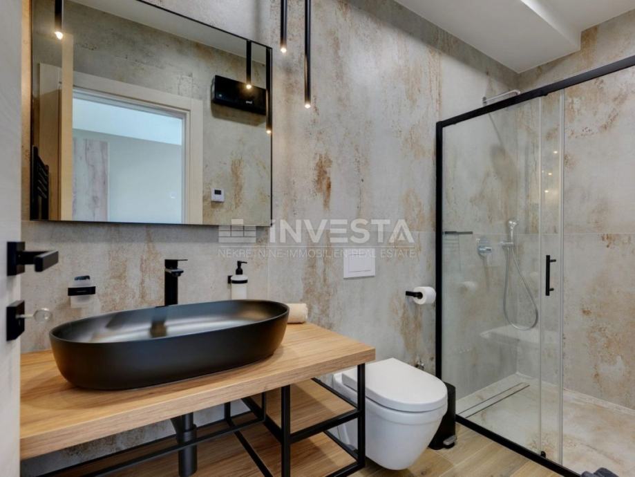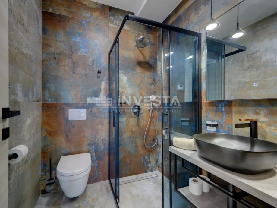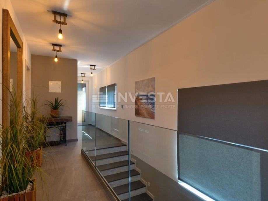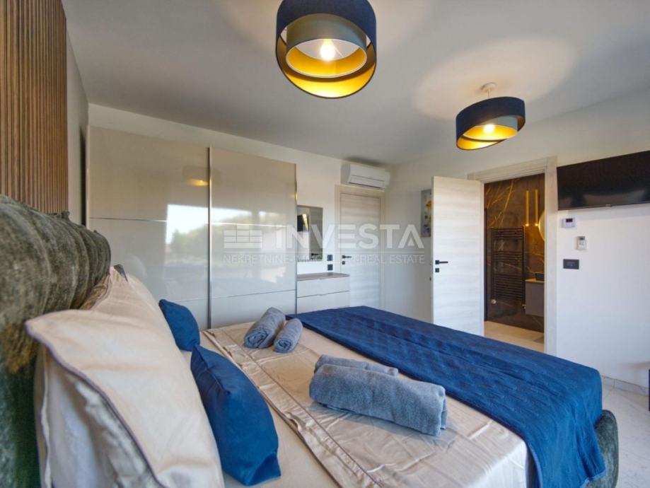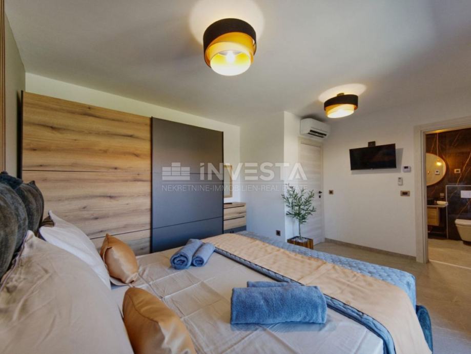 Unutarnje stubište vodi na gornju etažu, gdje su smještene dvije prostrane spavaće sobe od cca. 16 m², svaka s vlastitom kupaonicom od približno 5 m² i izlazom na natkriveni balkon površine 32,80 m². Ova etaža uključuje i privatnu wellness zonu s jacuzzijem i infracrvenom saunom, te dodatnu prostoriju površine 4,3 m² koja služi kao spremište i praonica, čineći gornji kat udobnim i funkcionalnim.