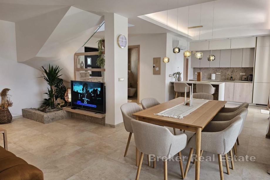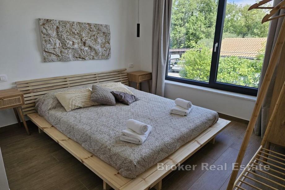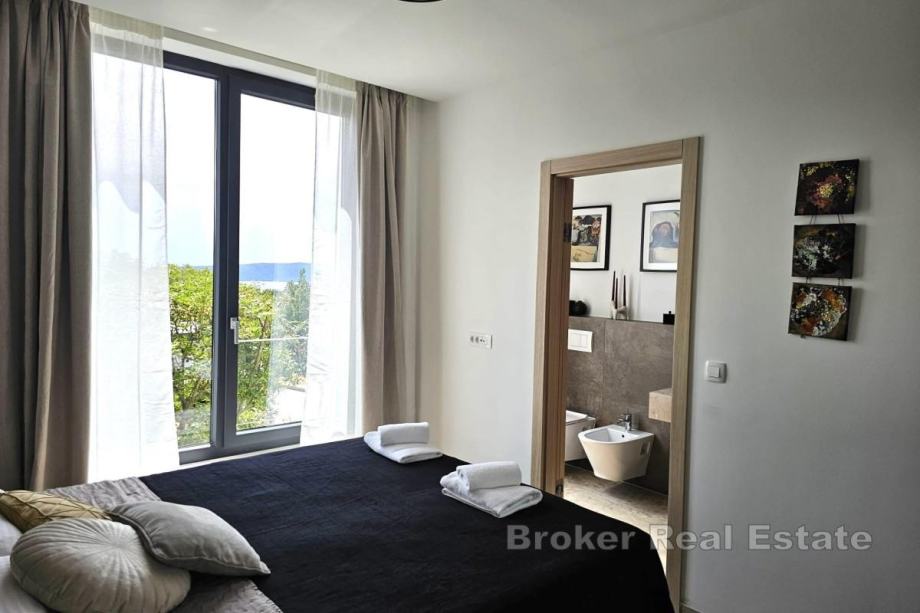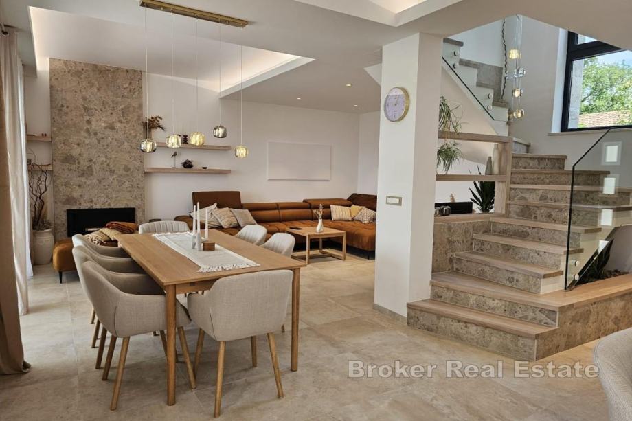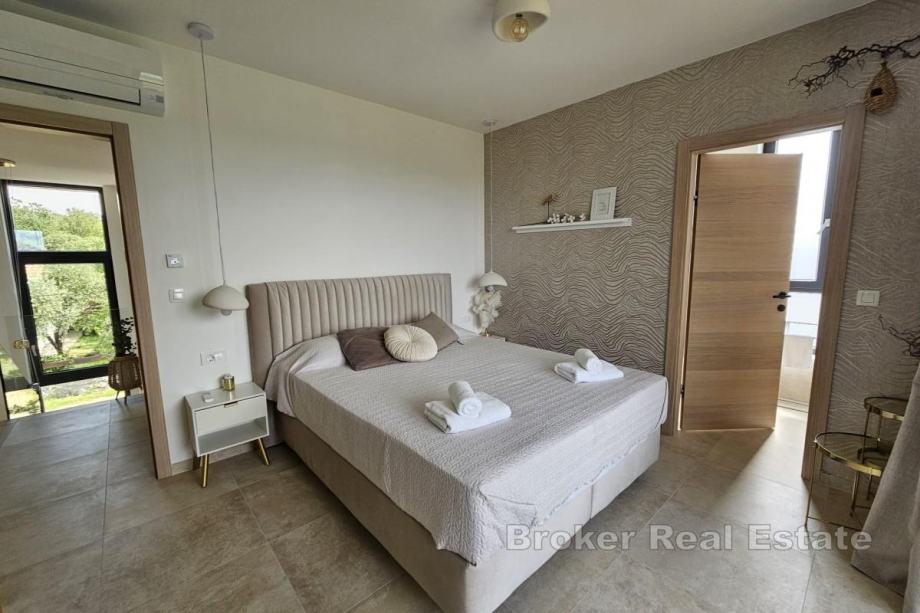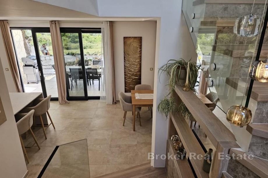 U okolici grada Krka, na prodaju je nova moderna vila s djelomičnim pogledom na more. Nekretnina je smještena na parceli površine 450 m² te ima ukupno 190 m² stambene površine, raspoređene na dvije etaže povezane unutarnjim stubištem.