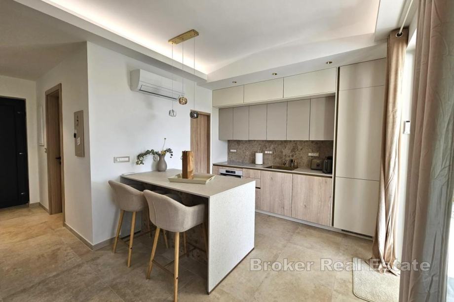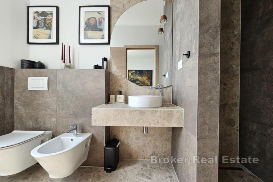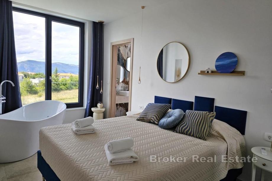 Vila je izgrađena korištenjem kvalitetnih materijala i opreme, uključujući keramičke podne obloge, multisplit sustav klimatizacije u svim prostorijama, podno grijanje, PVC stolariju, protuprovalna vrata i kvalitetnu sanitarnu opremu. Nekretnina je u potpunosti namještena i opremljena novim namještajem te se prodaje u viđenom stanju.
