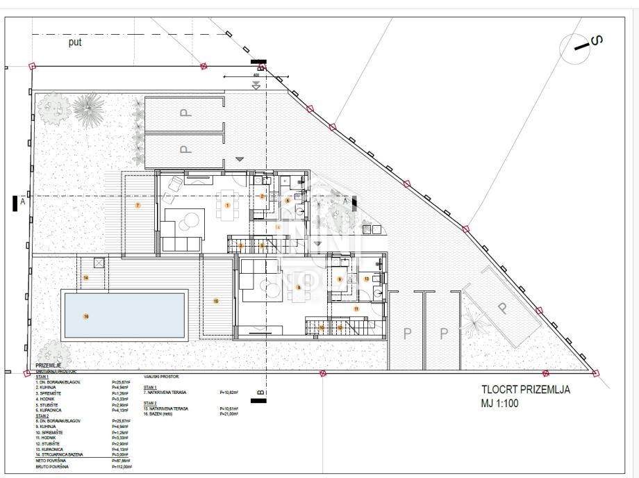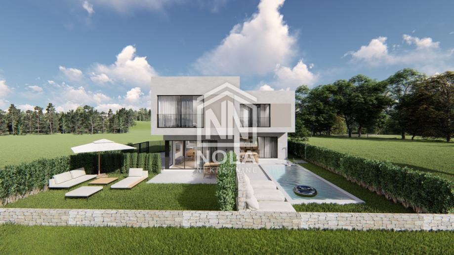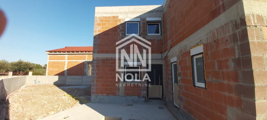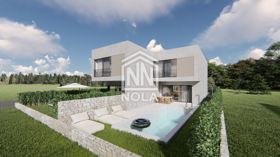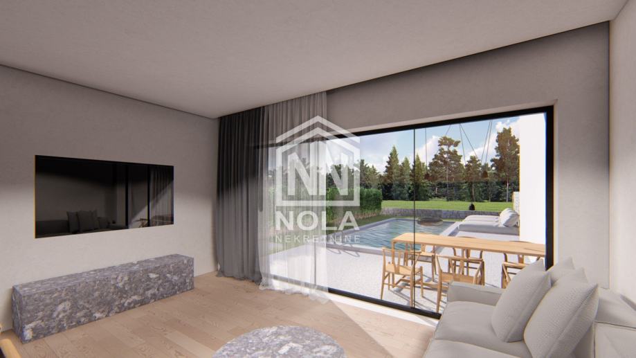 Prizemlje je prostrano i funkcionalno, s prostranim ulaznim hodnikom koji vodi u elegantni dnevni boravak otvorenog plana. Iz dnevnog boravka izlazi se na natkrivenu terasu koja se povezuje s okućnicom i bazenom, stvarajući savršen prostor za druženja i uživanje u mirnom okruženju. Tu su također i kupaonica te spremište, koji dodaju praktičnost i funkcionalnost prostoru.