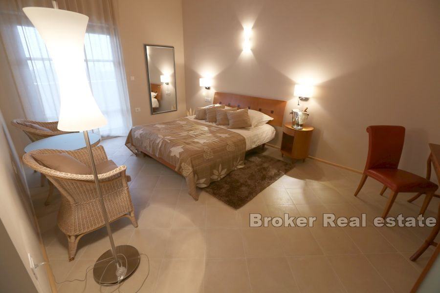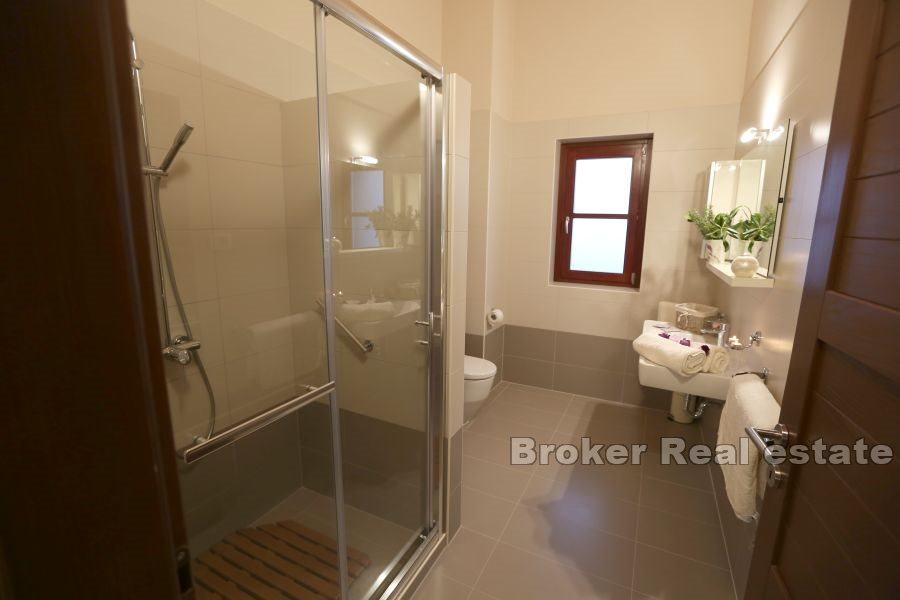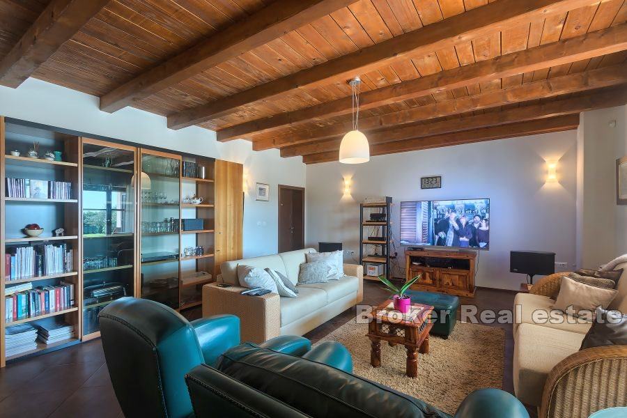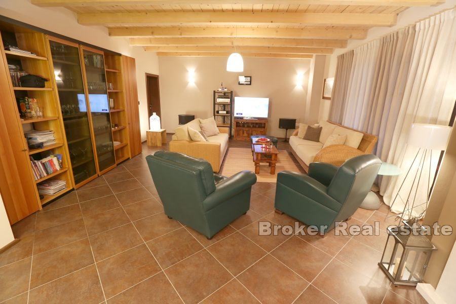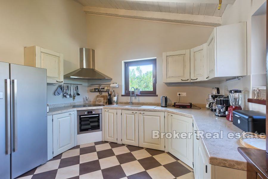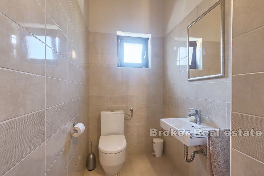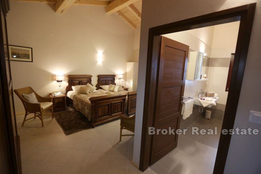 roštiljem i ljetnom kuhinjom, vešeraj i toalet. Prvi kat sastoji se od dvije spavaće sobe od koje