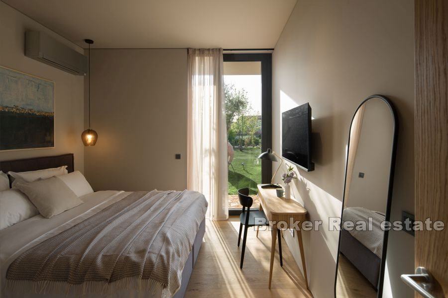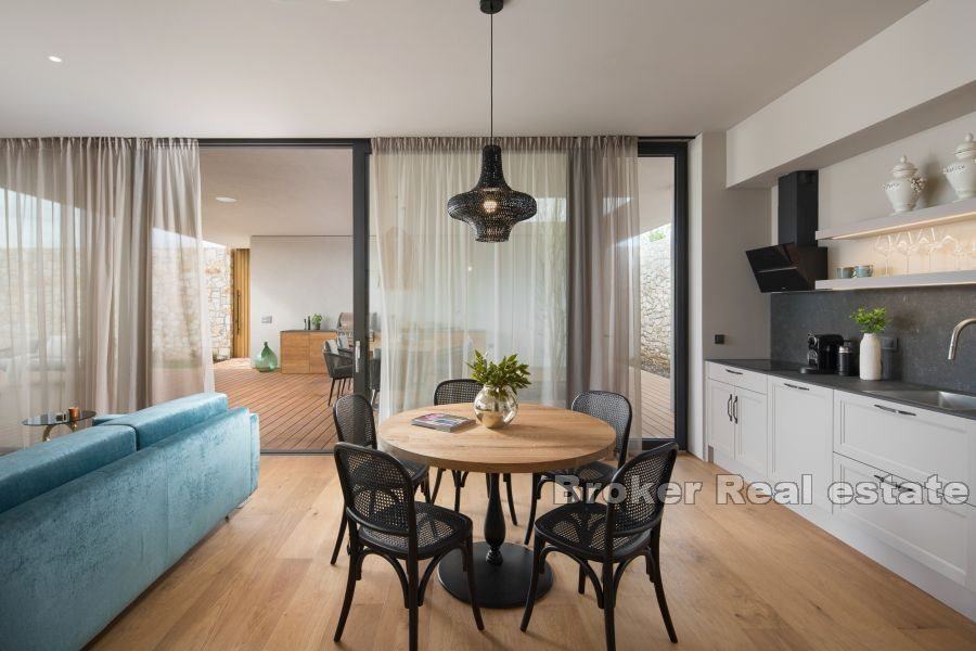 Moderni dizajn, mirna lokacija koja pruža potpuno uživanje u privatnosti te blizina svih potrebnih sadržaja za život čine ovu nekretninu odličnim odabirom kako za turizam tako i za cjelogodišnje življenje.