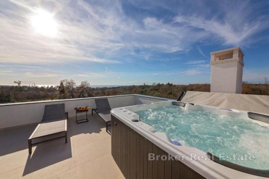 Prizemna je etaža s katom povezana modernim unutarnjim stubištem. Na katu se nalaze tri savaće sobe od kojih svaka ima vlastitu kupaonicu a neke i izlaz na terasu. Na krovnoj se terasi nalazi jacuzzi i s nje se pruža prekrasan otvoren pogled na more koje je od vile udaljeno oko 500 m.