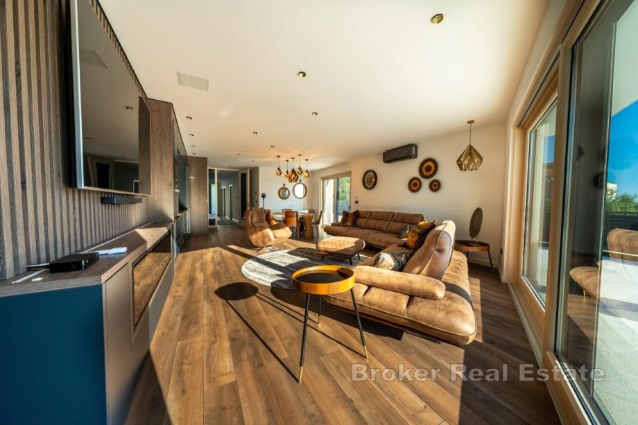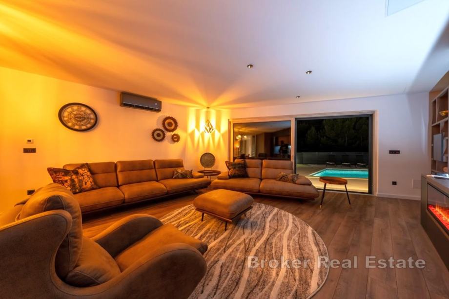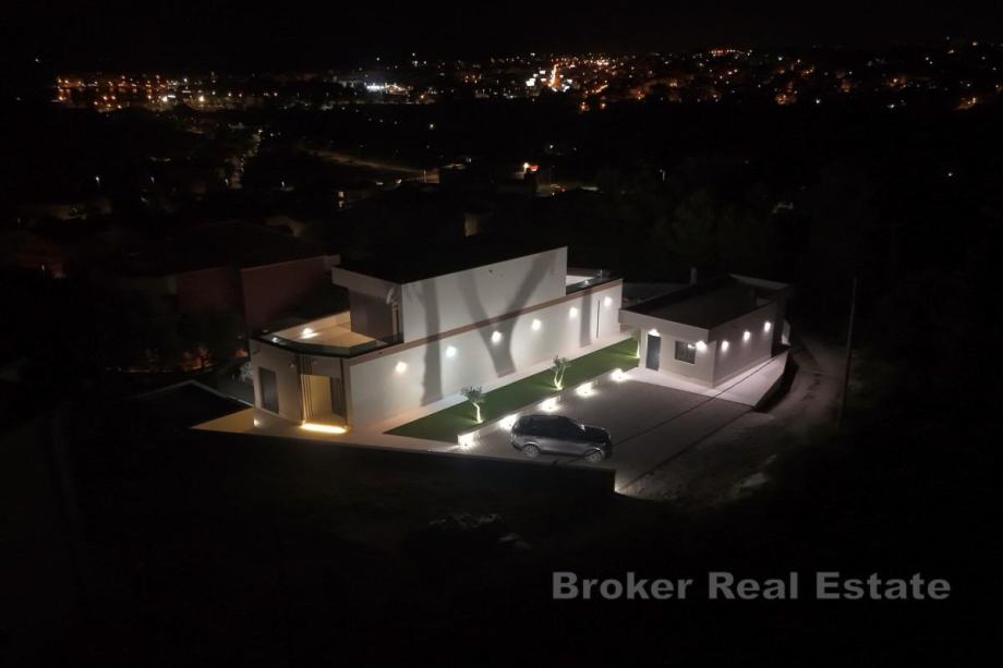 Ova moderna vila smještena je na mirnoj lokaciji u okolici Splita, na parceli od 830 m², s ukupnom stambenom površinom od oko 190 m².