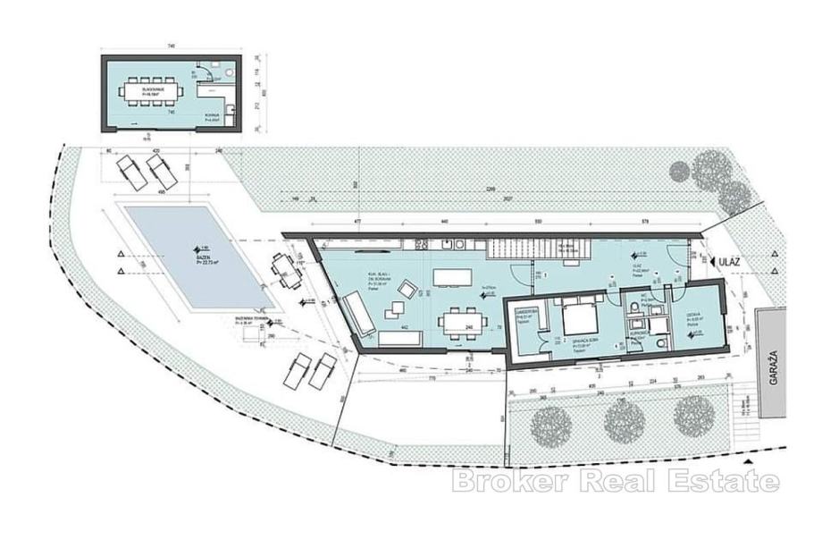 Proteže se na dvije etaže, s velikom terasom, sunčalištem i bazenom, te pomoćnim objektom u dvorištu, zamišljenim kao ljetna kuhinja za opuštanje i druženja.