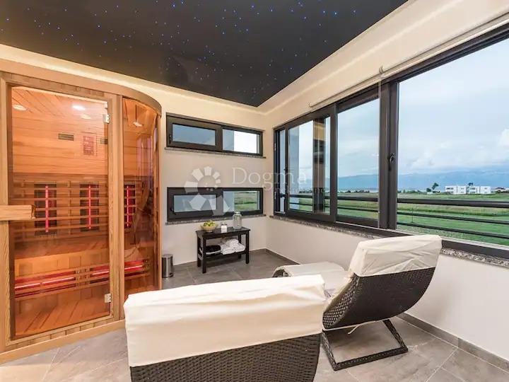 Vila ima dva kata i polukat na kojem je smještena wellness SPA oaza površine 30 m2 opremljena masažnom kadom, infracrvenom saunom, tušem i prostorom za opuštanje sa pogledom na more i Velebit. Cijeli taj wellness prostor krasi plafon izrađen kao zvjezdano nebo koji dodatno pridonosi opuštajućoj atmosferi.