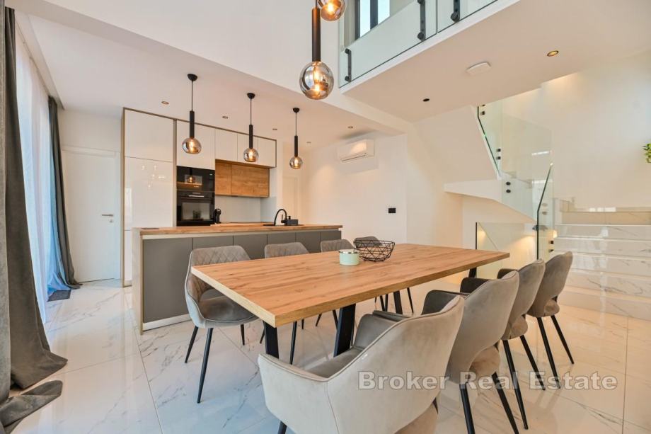 U suterenu se nalazi garaža. U prizemlju je smješten prekrasan moderan dnevni prostor otvorenog koncepta koji objedinjuje kuhinju, blagovaonicu i dnevni boravak. Kuhinja je funkcionalna i kompletno opremljena najkvalitetnijim kuhinjskim aparatima.