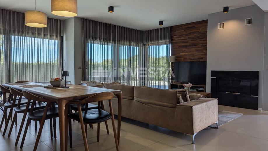 Velike staklene stijene otvaraju prostor prema terasi i bazenu, dok kamin stvara savršenu atmosferu za opuštanje. U prizemlju se nalaze i ostava/garderoba te gostinjski toalet.