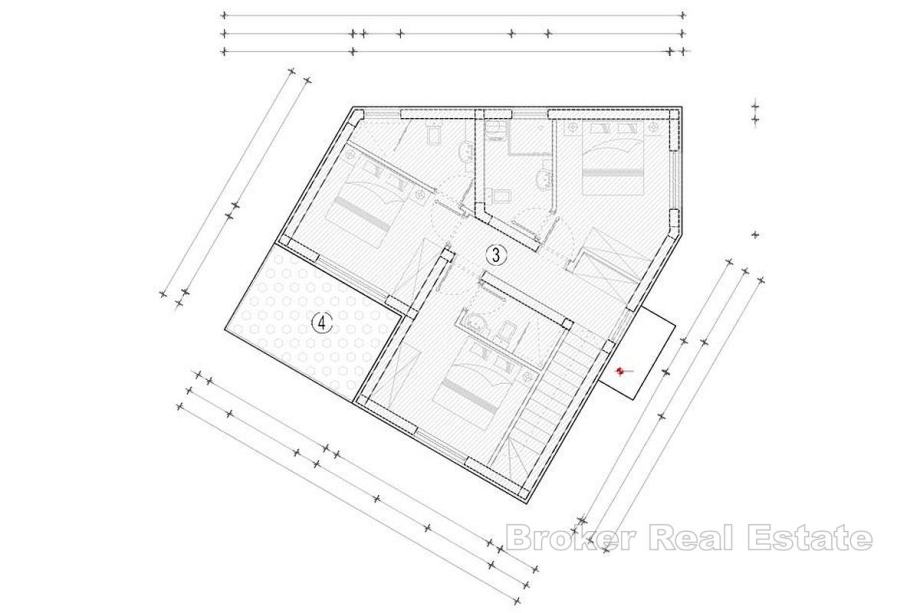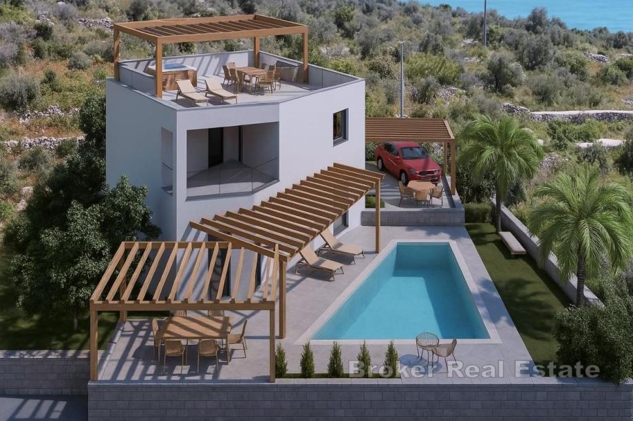 Na etaži prizemlja nalazi se jedna spavaća soba, kupaonica, kuhinja, te blagovaona i dnevni boravak s omogućenim izlazom u dvorište kuće, gdje je smješten bazen sa sunčalištem. Unutarnjim stepeništem se dolazi do etaže prvog kata gdje su smještene tri spavaće sobe od kojih svaka ima svoju kupaonicu, a jedna soba ima omogućen izlaz na vlastiti balkon s kojeg se pruža pogled na more.