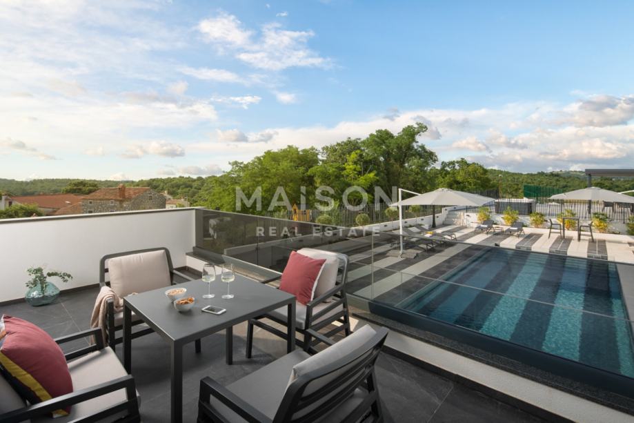 Ova impozantna vila smještena u mirnom istarskom selu prostire se na parceli od 3.790 m² i savršeno spaja modernu arhitekturu s vrhunskom udobnošću. S neto površinom od 180 m², vila uključuje 4 luksuzne spavaće sobe i 4 kupaonice, a nudi i prestižne sadržaje, uključujući grijani bazen, jacuzzi, privatni teniski teren, vanjski fitness i zabavnu sobu s biljarom i PlayStation konzolom.
