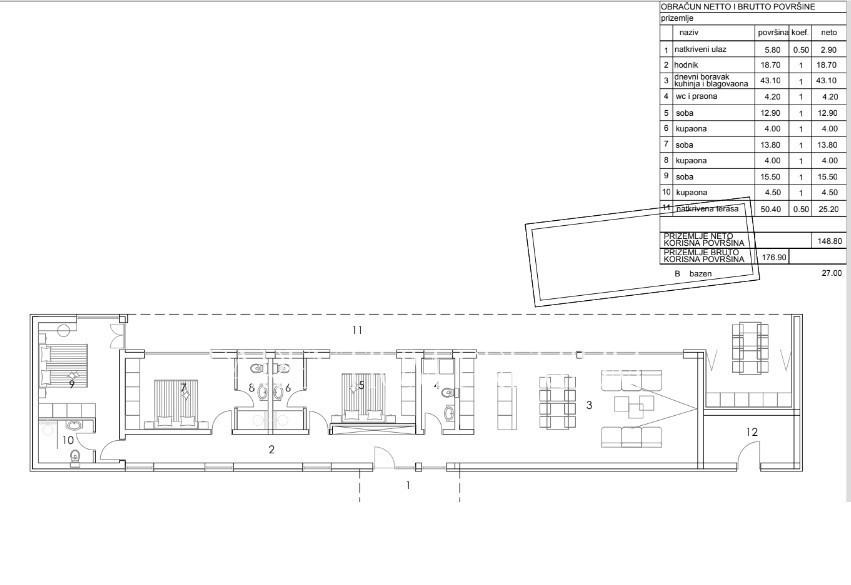 Prizemnica površine 176 m2 prostire se na parceli površine.