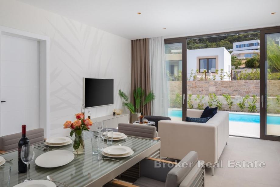 Nekretnina se sastoji od ulaznog hodnika koji vodi do jednog kupatila, jedne spavaće sobe, master spavaće sobe koja posjeduje svoje kupatilo, te otvorenog prostora s kojeg se može izići na prostranu terasu na kojoj se nalazi bazen i privatno sunčalište. Velike staklene stijene omogućuju obilje dnevnog svjetla i otvaraju pogled prema uređenom vrtu i terasi. Orijentacija nekretnine je istok – zapad što omogućuje pregršt svijetla tijekom cijelog dana.