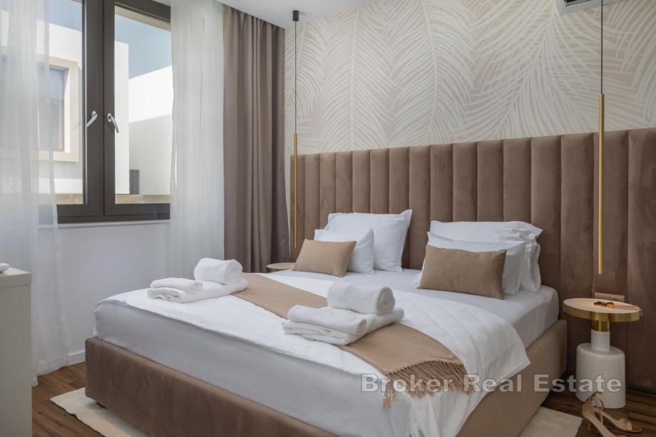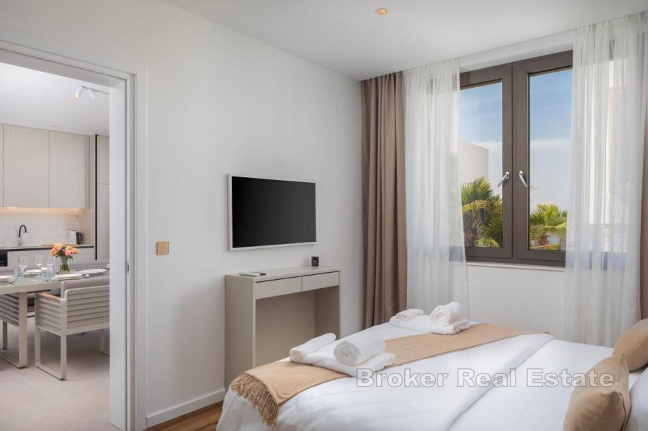 Pri gradnji nekretnine korišteni su visokokvalitetni materijali, dok je za dodatnu sigurnost osigurano podno grijanje, protuprovalna vrata… Osim bazena i sunčališta koje se nalazi na terasi nekretnine, ovaj resort posjeduje beach bar, vodeni park, restoran, recepciju te pregršt toga što doprinosi ugodnosti pri boravku u nekretnini.